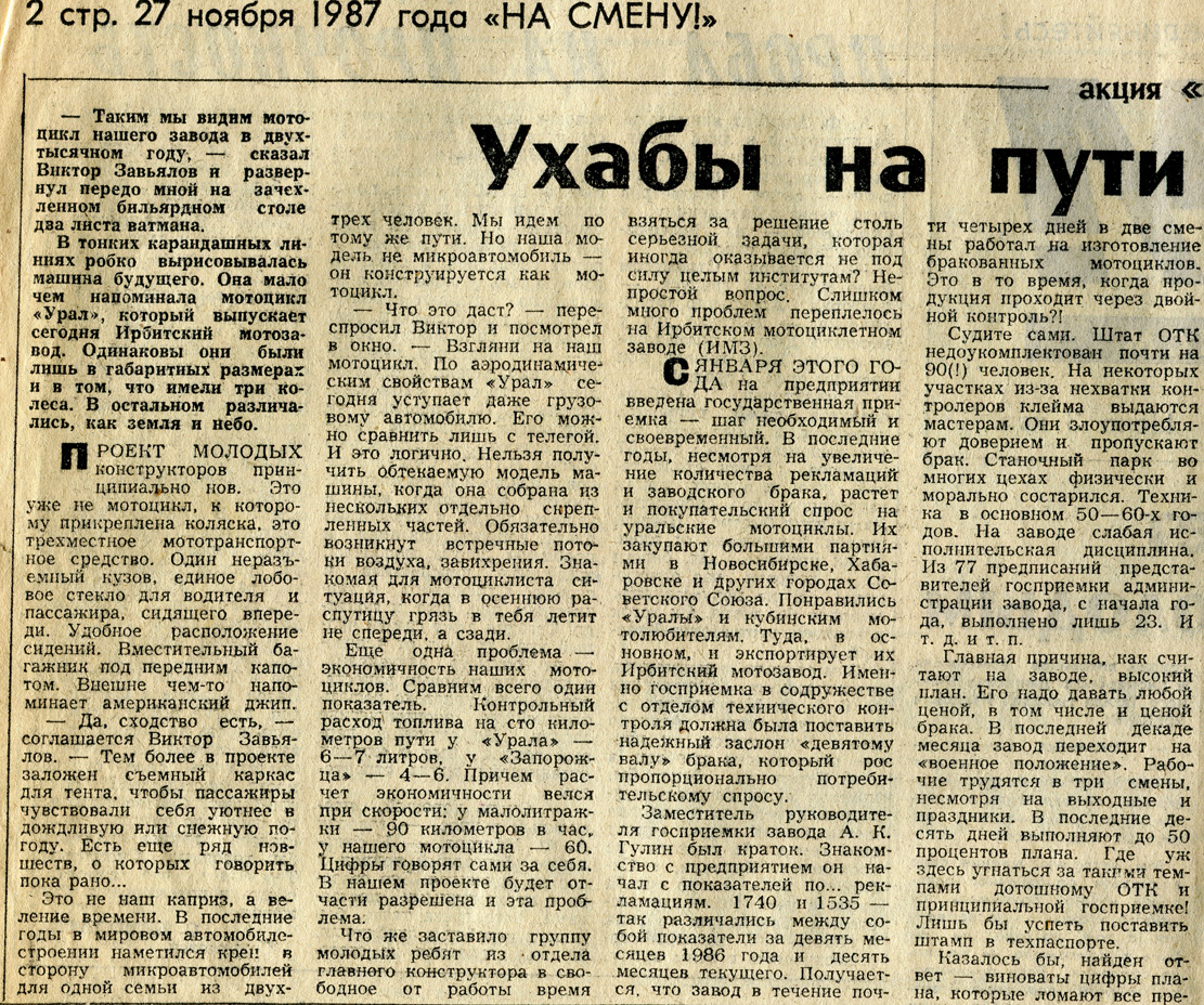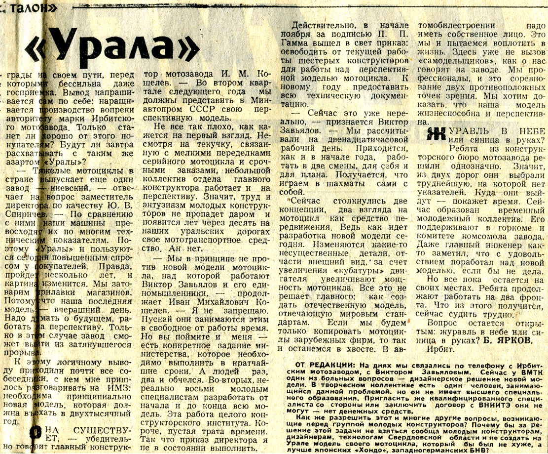 И так! После странного самоубийства Иванова Александра Михайловича директором Мотозавода становится Тряпичкин Вадим Александрович. Вот я точно не ожидал, что буду с ним вести творческие беседы по перспективе мотоцикла Урал. Мы с ним спорили по некоторым вопросам до анекдотичного состояния.